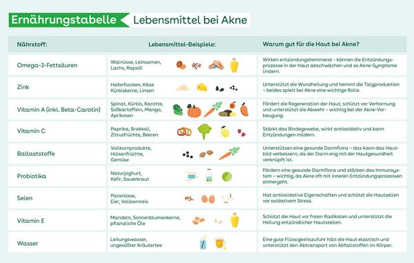 Wichtig ist Es gibt keine pauschale Anti-Akne-Diät. Was individuell hilft, sollte mit einer Ärztin oder einem Arzt besprochen werden – besonders bei starken Einschränkungen oder dem Verdacht auf Unverträglichkeiten. Nicht nur für Akne-Betroffene wichtig ist eine ausgewogene Ernährung mit viel Gemüse, Obst (v. a. Beeren), Vollkornprodukten und ausreichend ungesüßten Getränken.
